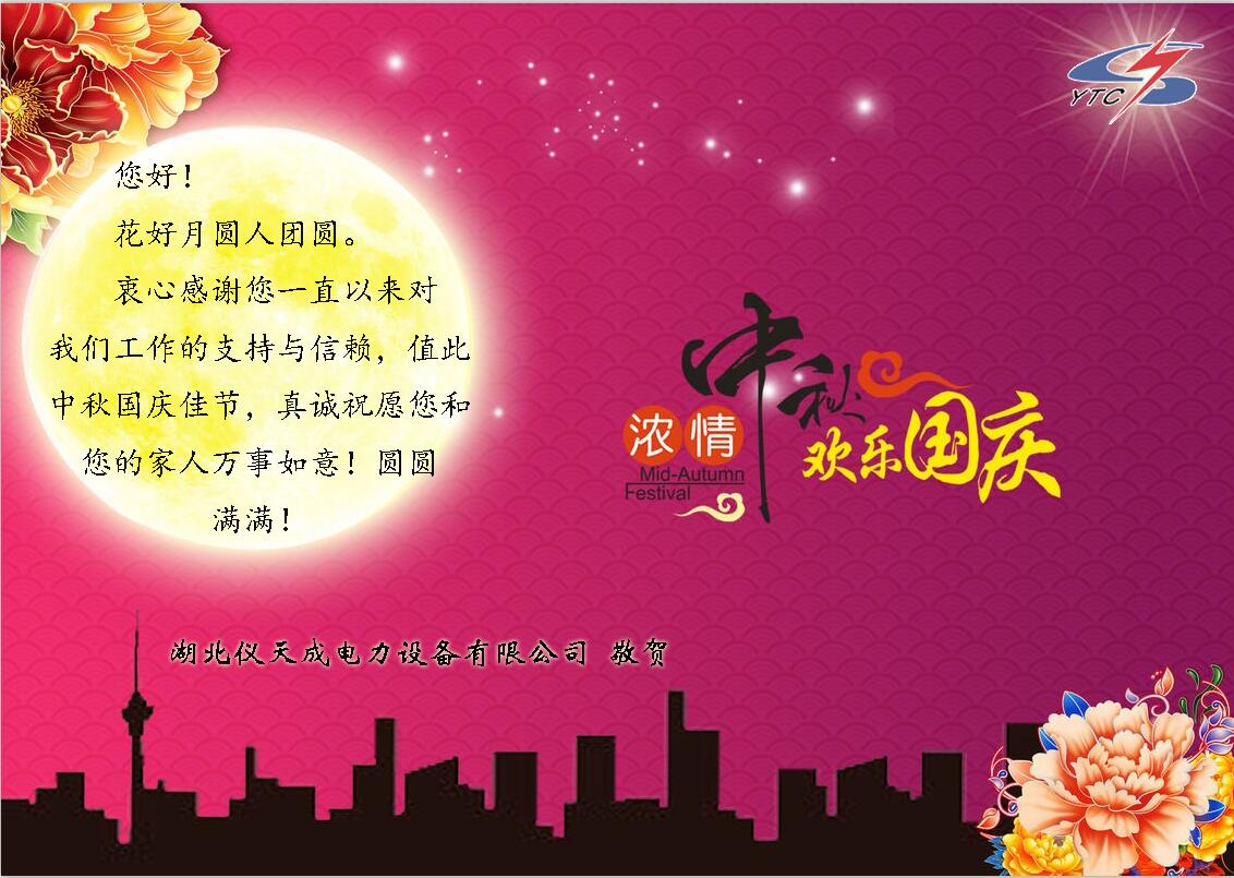 在這舉國歡慶的時刻,湖北儀天成電力設備有限公司衷心的祝愿祝所有的員工,所有的新老客戶,國慶節以及中秋節快樂!