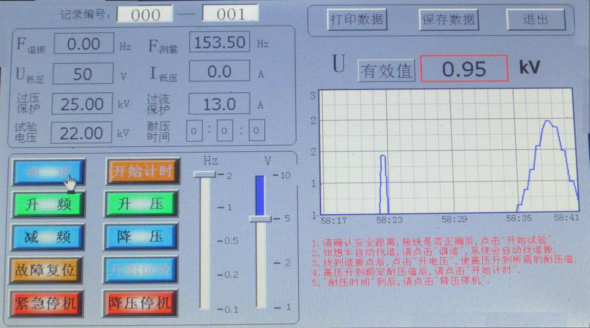 如不想自動(dòng)找諧振點(diǎn),先點(diǎn)擊“升電壓”,將“U低壓”升到50V,再點(diǎn)擊“升頻率”來找諧振點(diǎn),找到諧振點(diǎn)后,點(diǎn)擊“升電壓”, 顯示界面如圖所示。