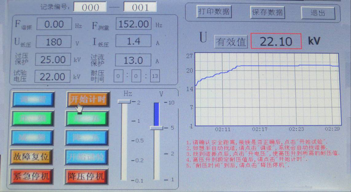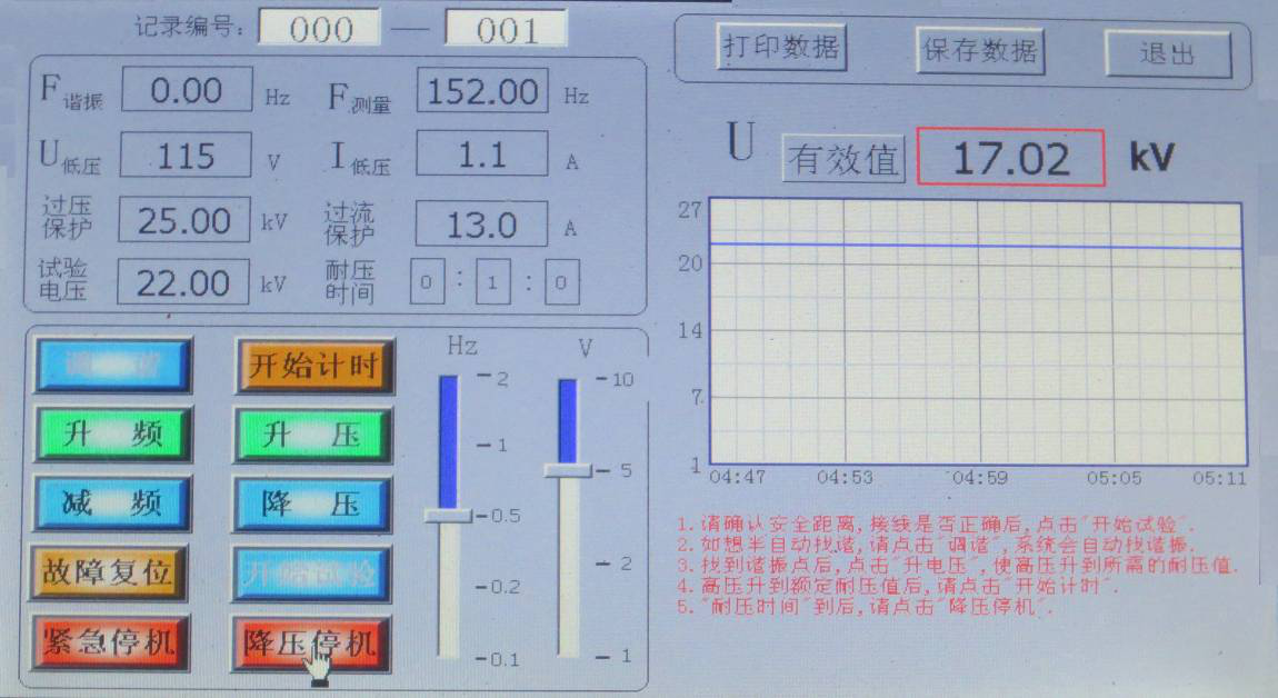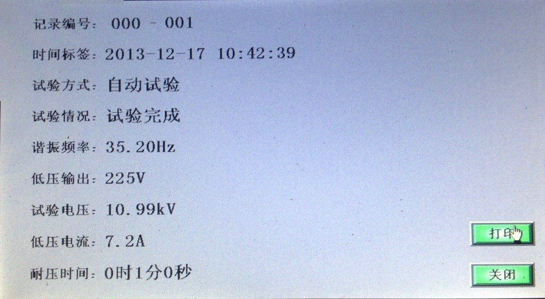 當(dāng)U諧振電壓降壓0時(shí),試驗(yàn)完成,如想查詢?cè)囼?yàn)記錄,請(qǐng)?jiān)诮祲呵包c(diǎn)擊保存數(shù)據(jù),降壓后點(diǎn)擊“文件管理”; 顯示界面如圖所示。