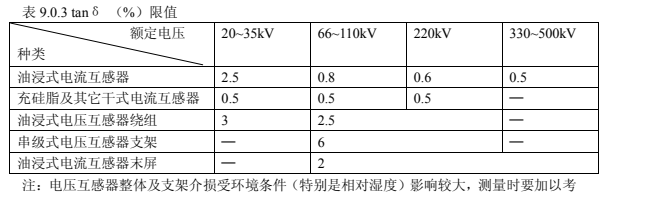 1.互感器的繞組 tanδ測量電壓應(yīng)在 10kV 測量,tanδ不應(yīng)大于表 9.0.3 中數(shù)據(jù)。當(dāng)對絕緣有懷疑時,可采用高壓法進(jìn)行試驗,在(0.5~1) Um√3 范圍內(nèi)進(jìn)行,tanδ變化量不應(yīng)大于0.2% ,電容變化量不應(yīng)大于0.5%;