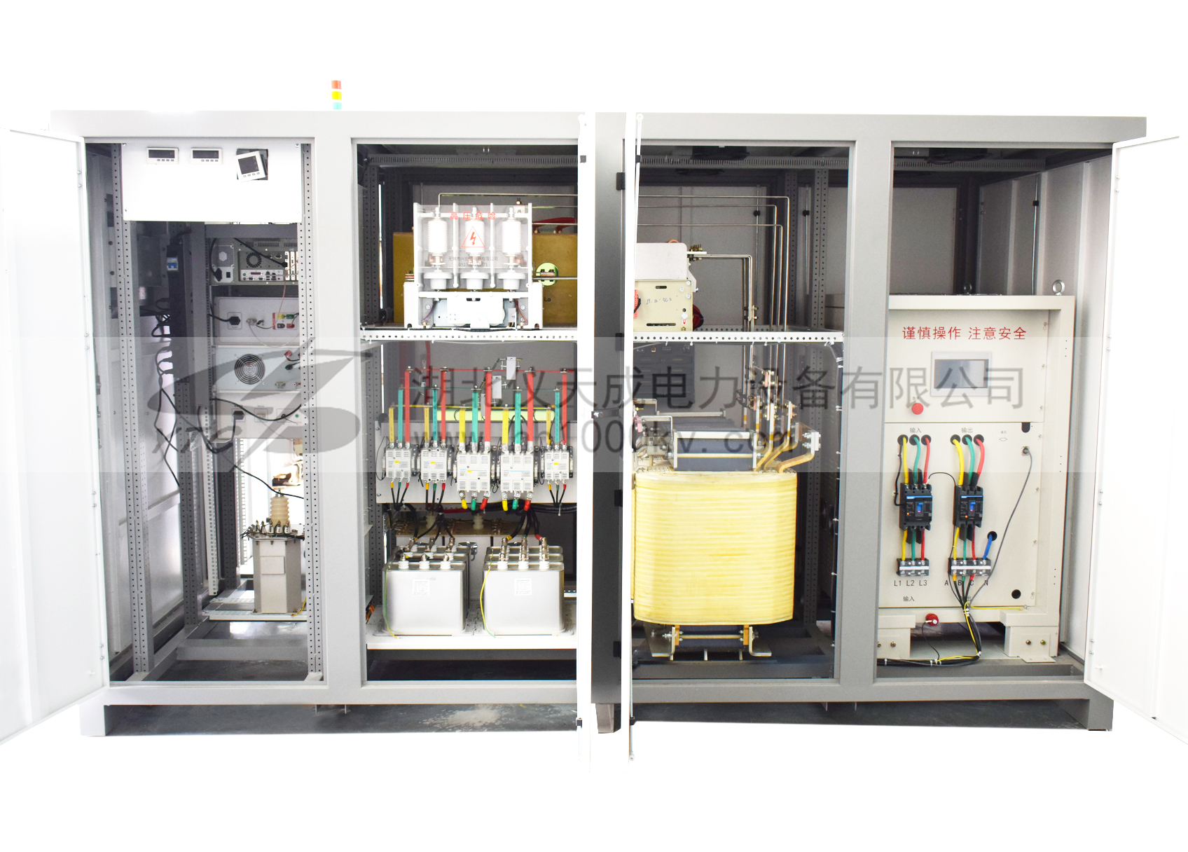 該試驗臺主要是對電力變壓器,配電變壓器的直流電阻及變比測試,空載、負載特性及感應耐壓,工頻耐壓試驗及溫升進行試驗。