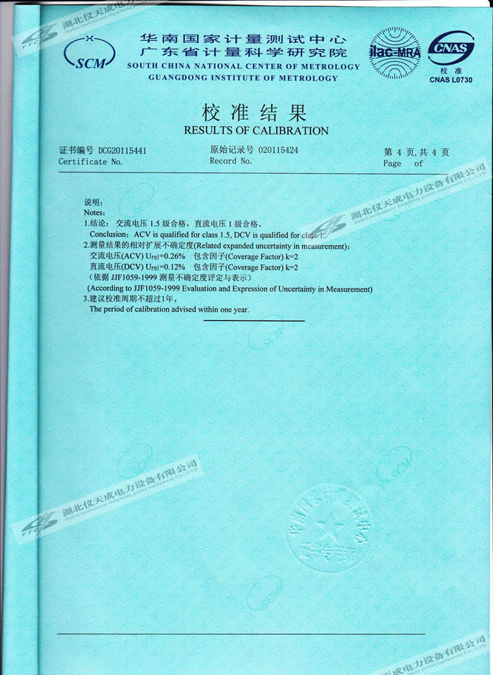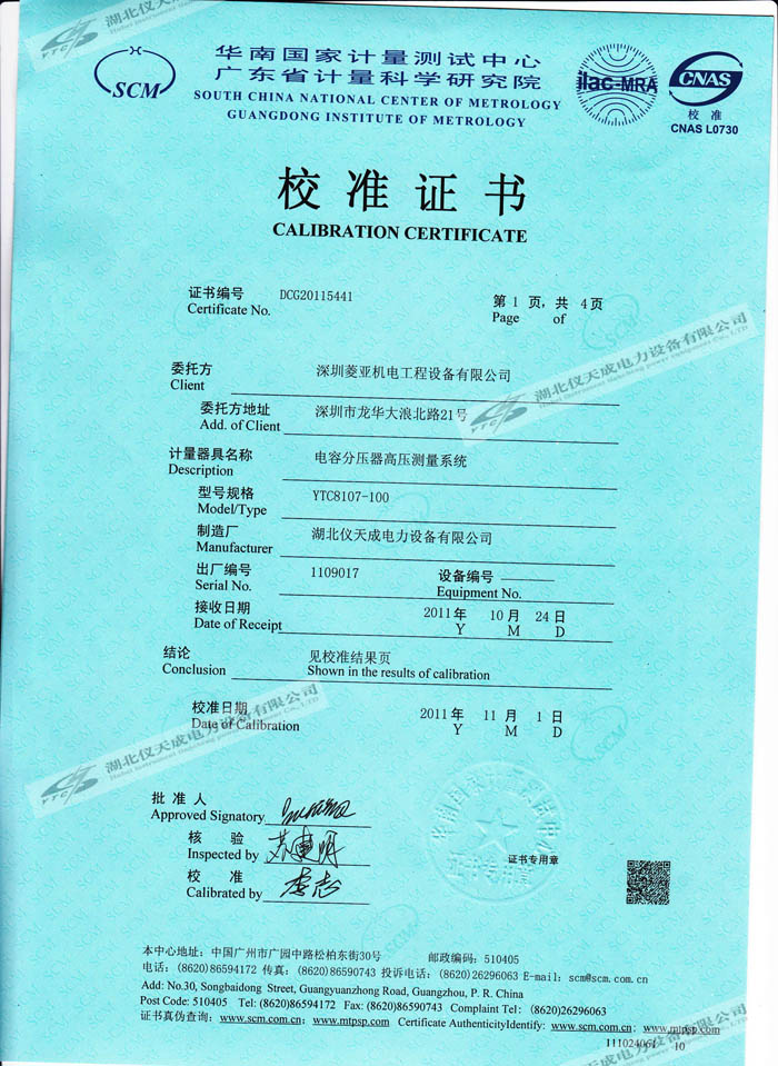 轉載:"YTC8107-100電容分壓器高壓測量系統的資質證書" 請注明來源于儀天成電力。 更多技術問題請致電儀天成電力客戶服務:027-87876585,技術部專線:027-87876585,在線客服:719388481