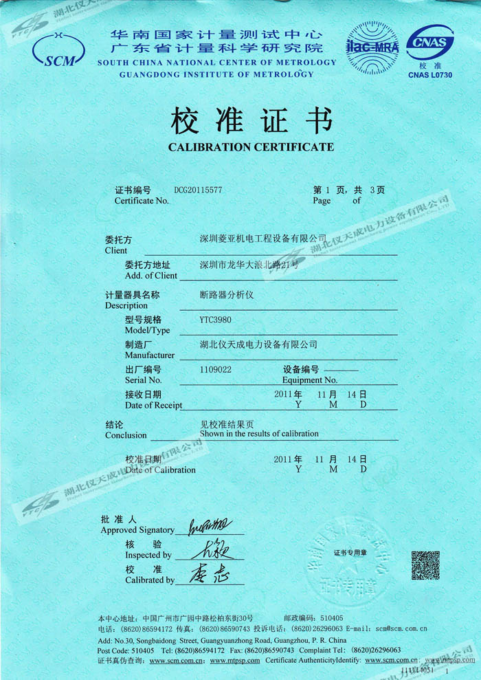 轉載:"YTC3980斷路器分析儀的資質證書" 請注明來源于儀天成電力。 更多技術問題請致電儀天成電力客戶服務:027-87876585,技術部專線:027-87876585,在線客服:719388481